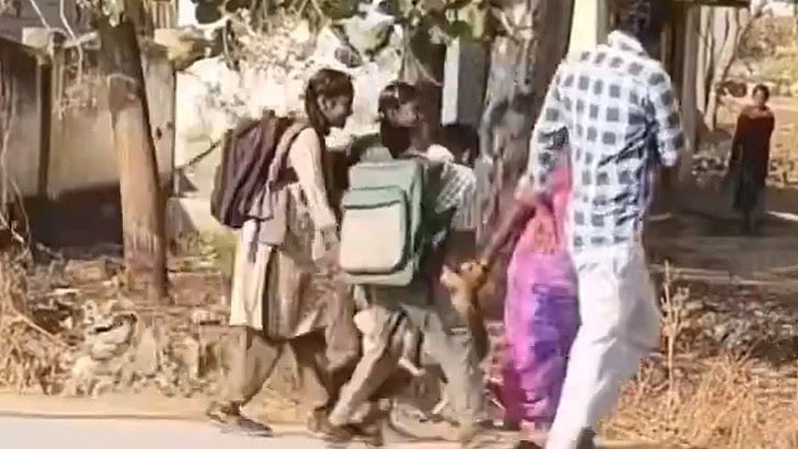 The clip also shows another small boy wearing a purple shirt walking alongside them while holding the reluctant child’s slippers, making the scene even more adorable.